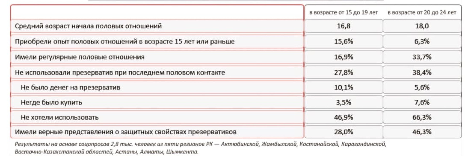 Недавний опрос среди подростков Казахстана раскрыл важные аспекты их сексуальной жизни и связанные с ней риски. В исследовании, проведенном среди 2800 молодых людей в возрасте от 15 до 24 лет, участвовали жители таких городов, как Астана, Алматы и Шымкент, а также представители Актюбинской, Жамбылской, Костанайской, Карагандинской и Восточно-Казахстанской областей.