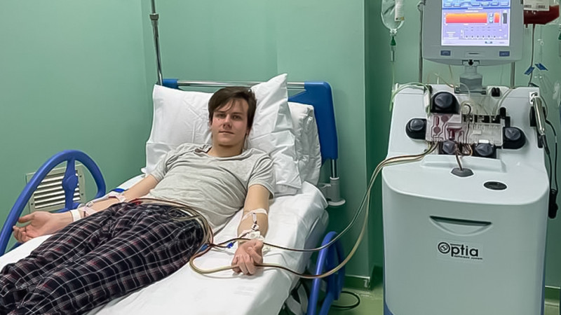 Юрий Алёшкин во время процедуры забора клеток костного мозга. Фото из архива героя материала.