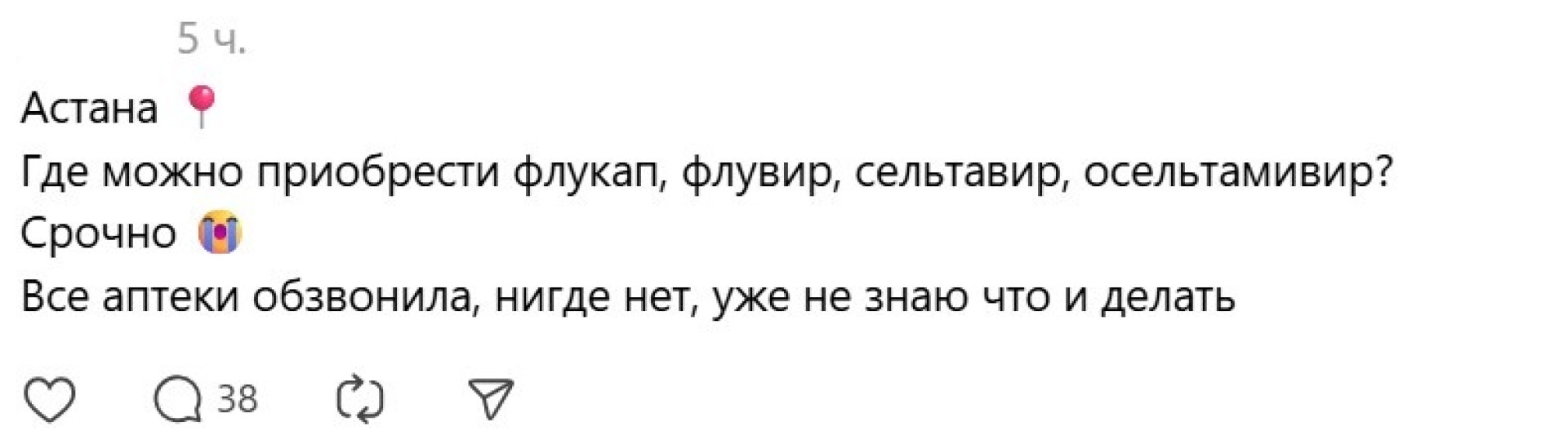 Казахстанцы начали активно сообщать о дефиците определенных противовирусных препаратов в аптеках, особенно тех, которые используются для лечения сезонных вирусов и гриппа. В частности, наблюдается нехватка таких лекарств, как флукап, флувир и тамифлю. Наибольшее количество жалоб поступает от жителей Астаны, чьи дети страдают от гриппа и не могут найти назначенные врачами медикаменты.