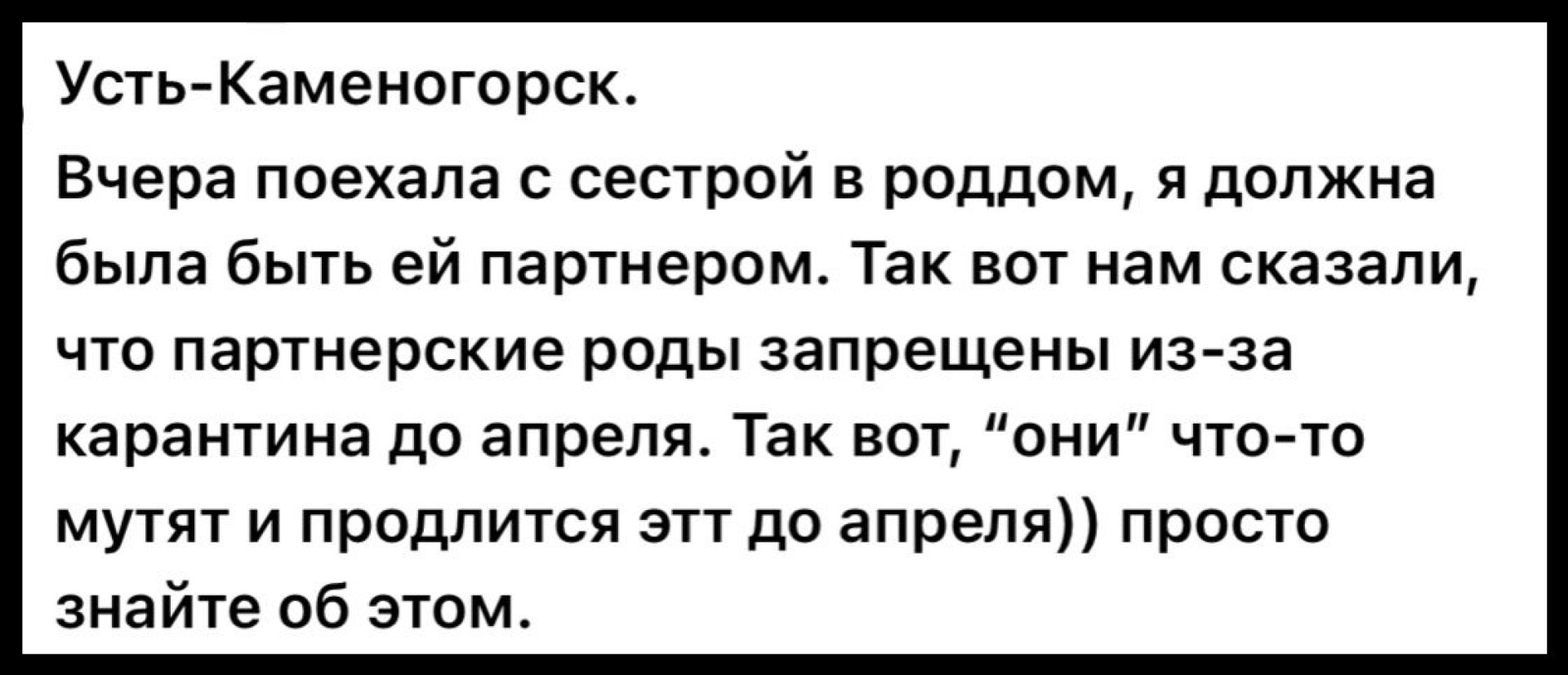 "Усть-Каменогорск. Вчера поехала с сестрой в роддом — я должна была быть её партнёром. Но нам сказали, что партнёрские роды запрещены из-за карантина до апреля. Просто имейте в виду", — написала автор.