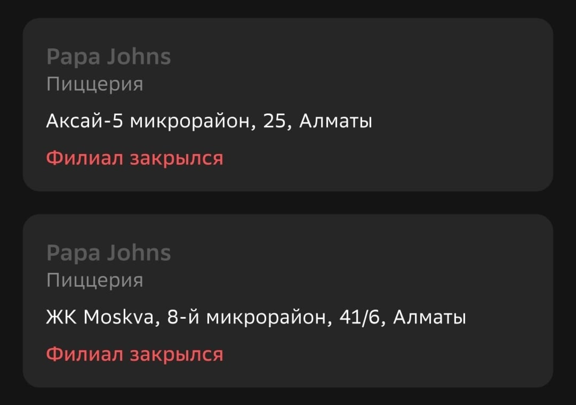 Сообщается, что многие филиалы Papa John's в Алматы уже закрыты, а контактные номера, размещённые на официальном сайте, отключены.