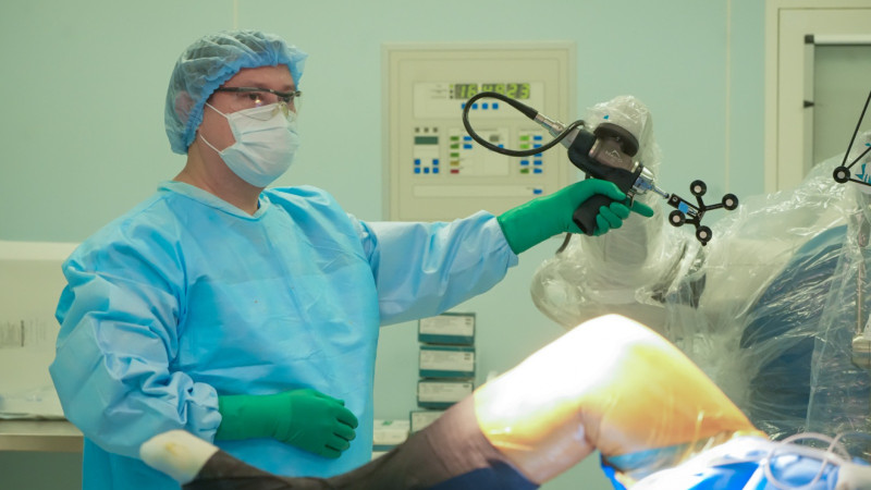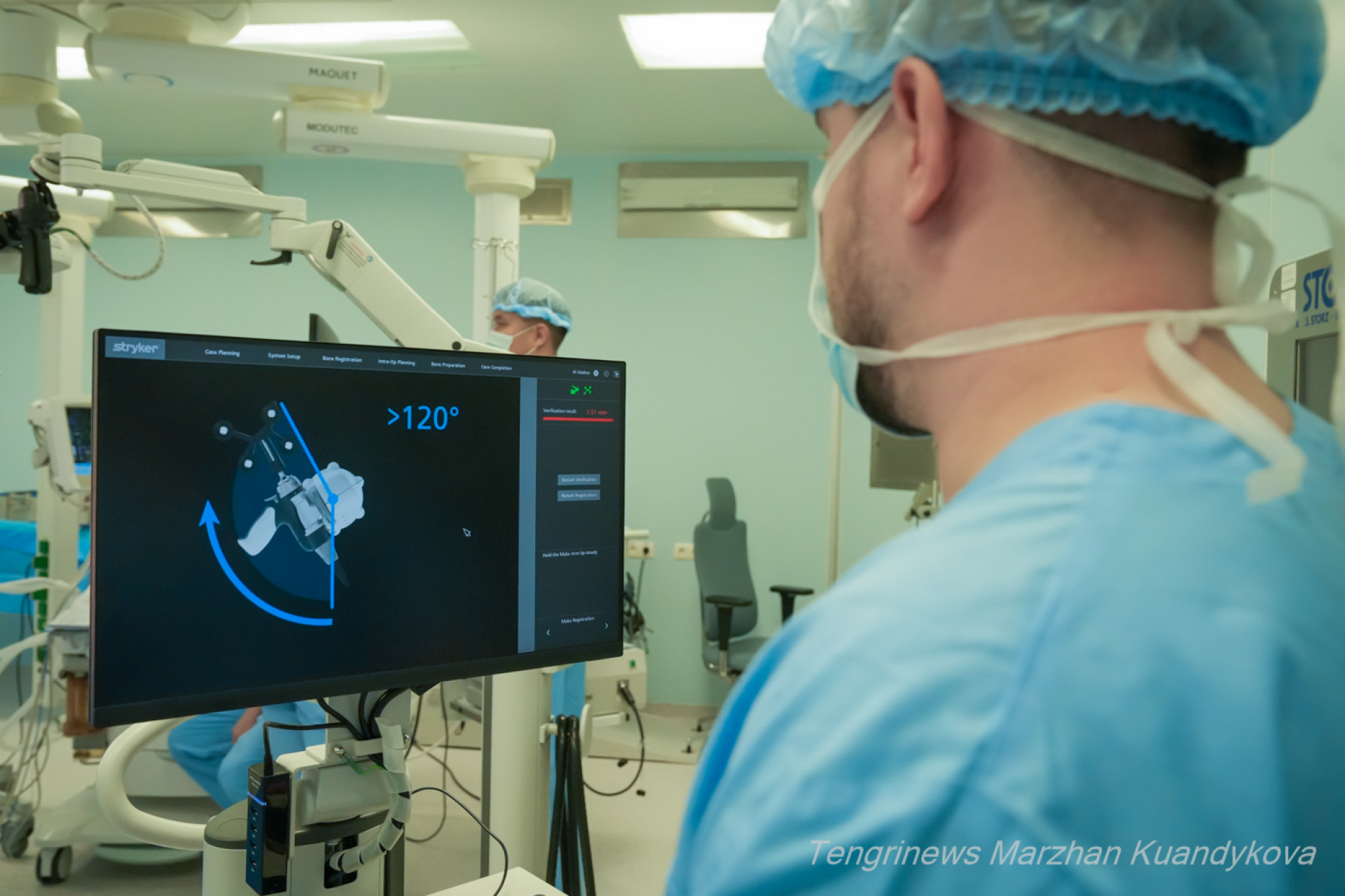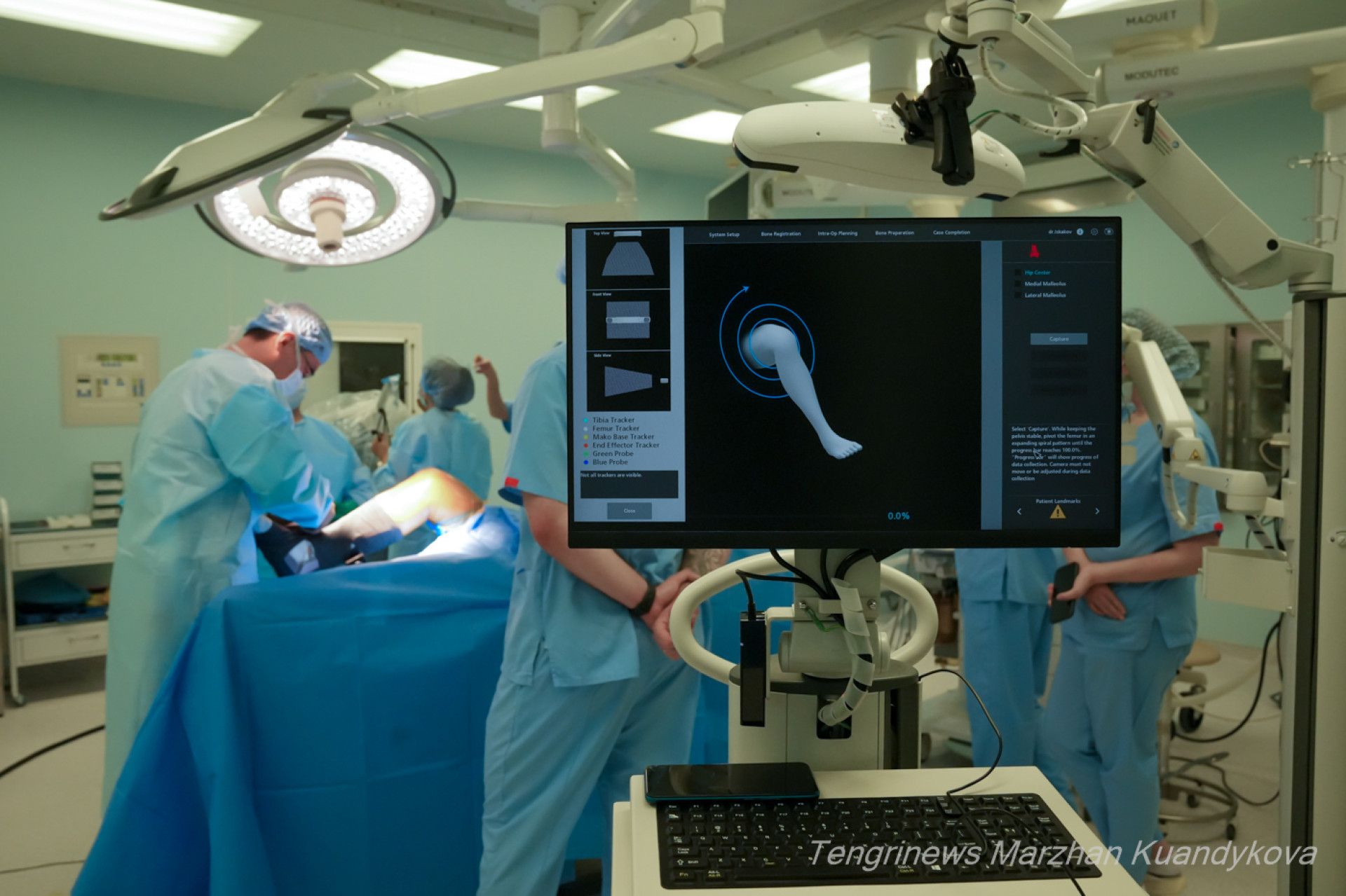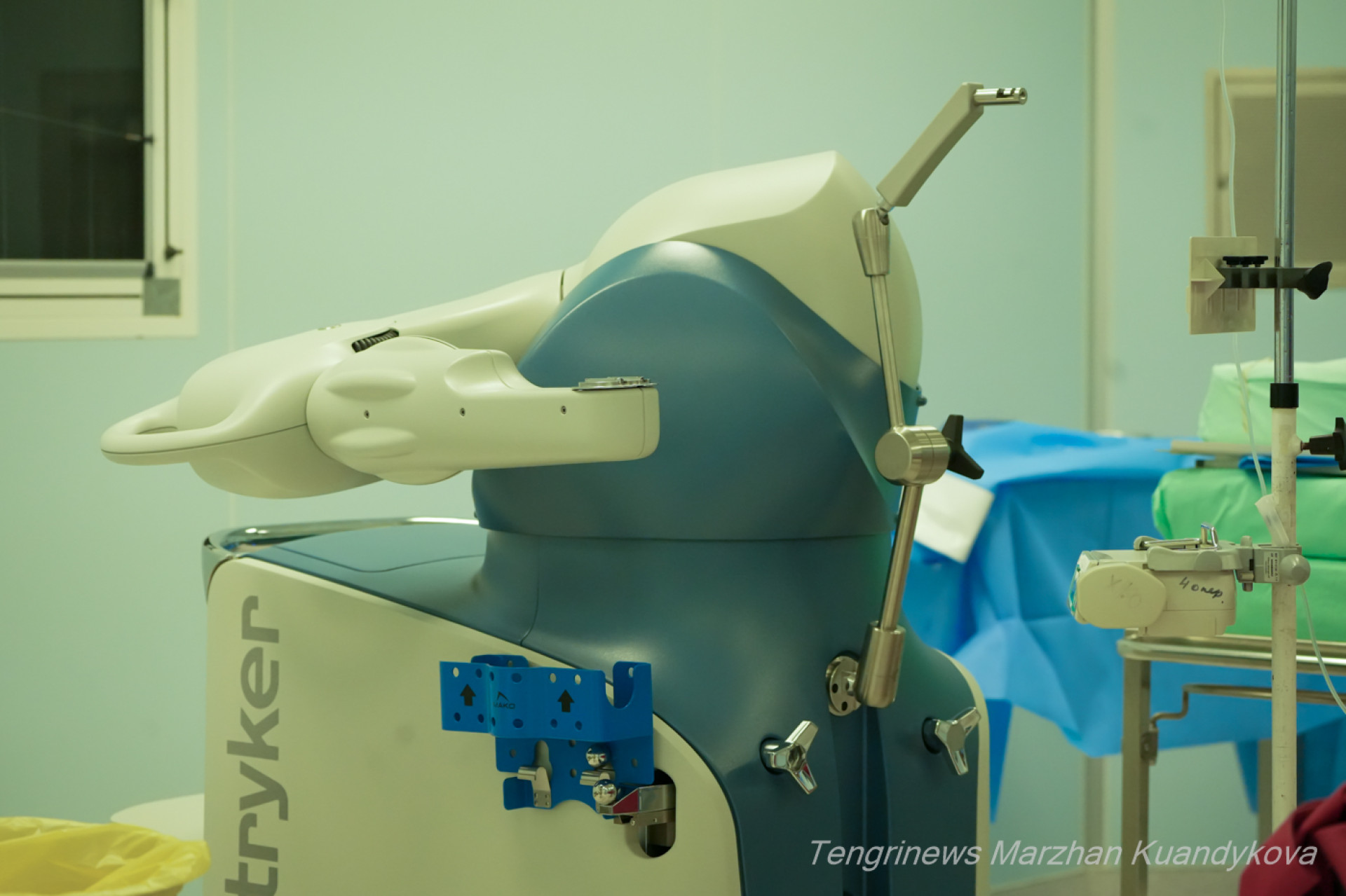 В операционную уверенно входит хирург Булат Искаков, заведующий отделением травматологии, имеющий за плечами более 10 тысяч операций. Он один из первых специалистов, начавших использовать роботизированное эндопротезирование в Казахстане.