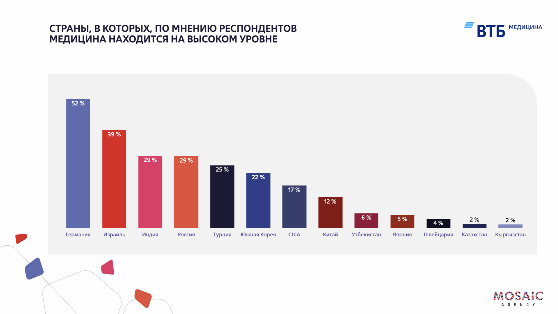 По результатам опроса, Германию, Южную Корею и Израиль респонденты чаще всего упоминают как лидеров по качеству медицины и уровню сервиса. Россия также демонстрирует рост доверия среди пациентов из СНГ и Центральной Азии, благодаря высокой квалификации специалистов, доступу к современным технологиям и успешным результатам лечения. Согласно статистике, с 2021 по 2024 год российские клиники оказали помощь более 5 миллионам пациентов из Казахстана, Узбекистана и Кыргызстана.