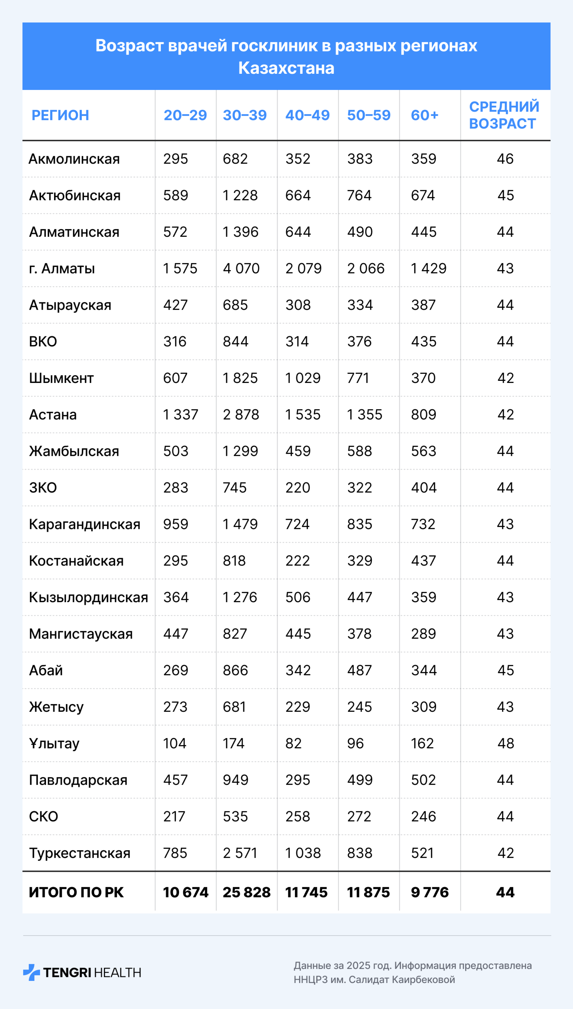 Согласно исследованию, средний возраст врачей в государственных клиниках варьируется от 42 лет в Туркестанской области, Шымкенте и Астане до 48 лет в Улытау. В среднем по стране этот показатель составляет 44 года.