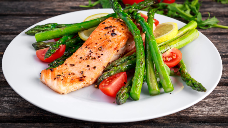 На тарелку выложите картофель, сверху — спаржу и филе лосося;