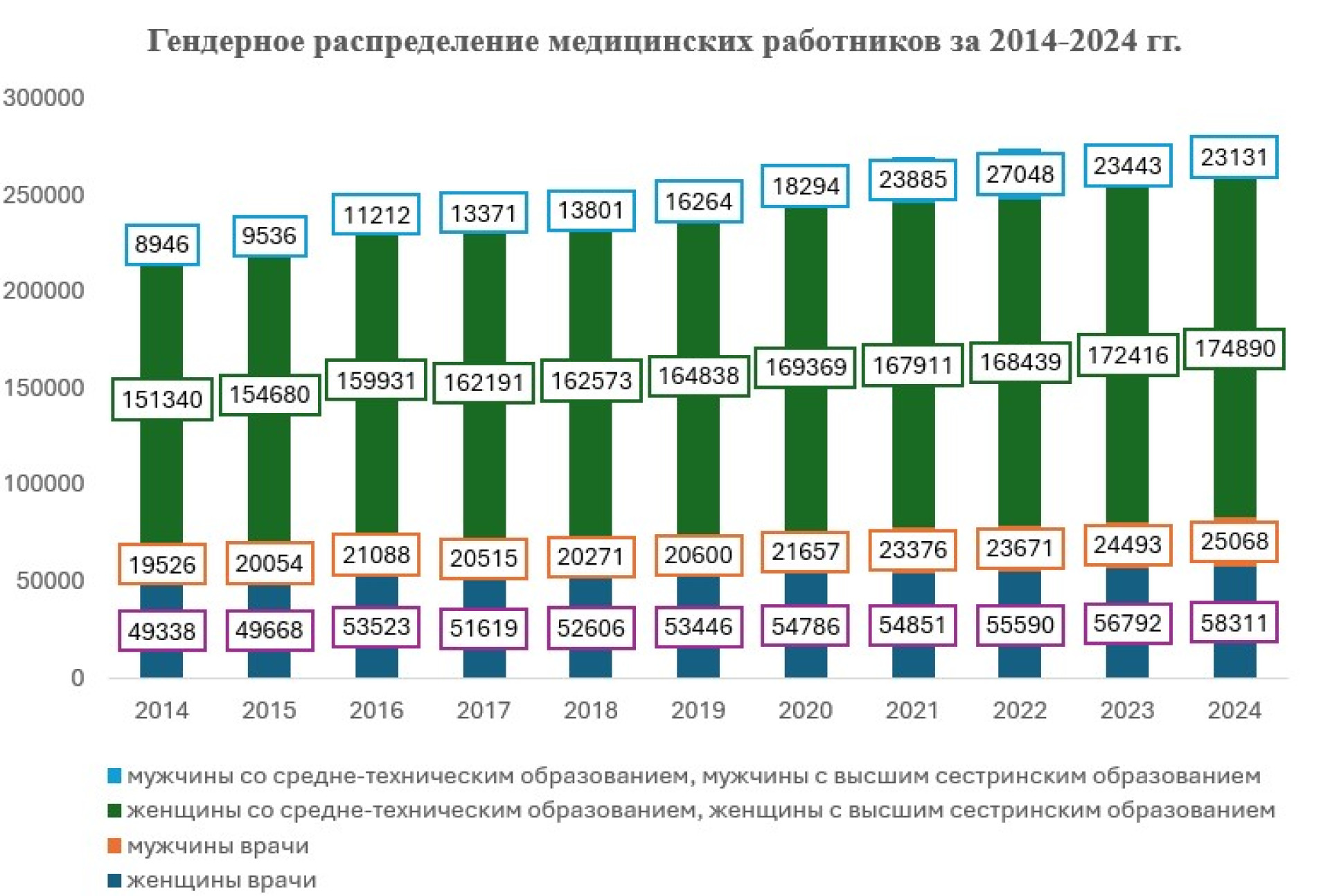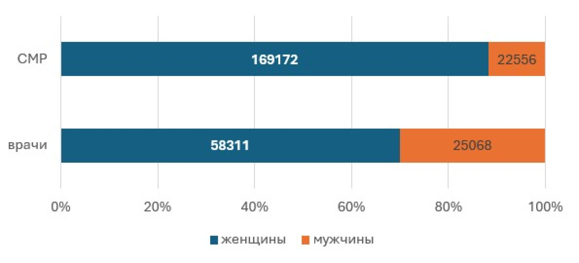 На сегодняшний день женщины составляют 83% от общего числа медицинских работников в стране, включая врачей, медсестер, акушерок и других специалистов. Среди врачей доля женщин составляет более 70% — это 58 311 человек, тогда как мужчины составляют 30%, что соответствует 25 068 человек.