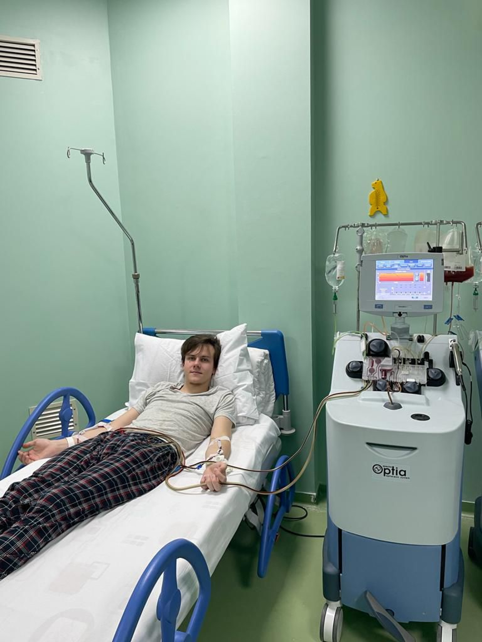 Азамат Жаримбетов во время процедуры сдачи клеток костного мозга. Фото из архива героя материала