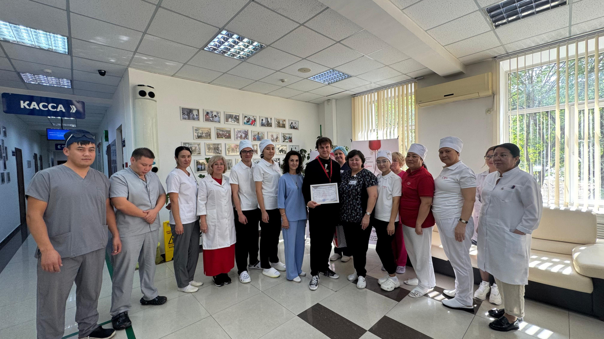 Юрий Алёшкин и врачи Республиканского центра крови в Алматы. Фото предоставлено фондом имени Асель Байсеитовой