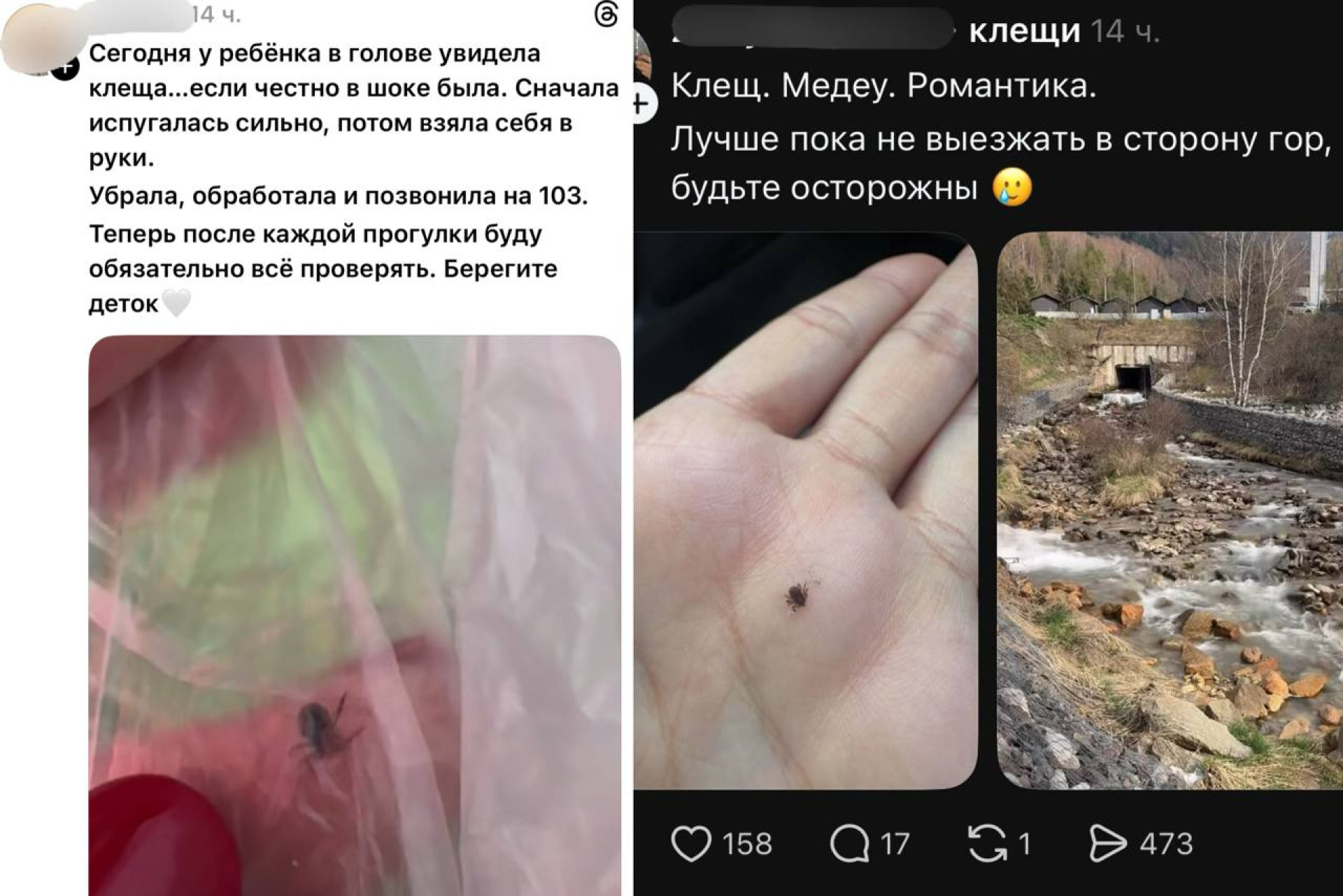 Другие пользователи также сообщают о встречах с клещами, например, одна девушка опубликовала фотографию найденного клеща во время поездки в горы Медеу.