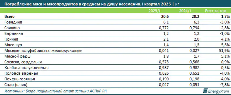 В Казахстане наблюдается рост потребления мяса и мясопродуктов, несмотря на их подорожание. По данным EnergyProm, в первом квартале текущего года среднее потребление мяса на душу населения составило 20,6 килограмма, что на 1,7% больше, чем в аналогичном периоде прошлого года.