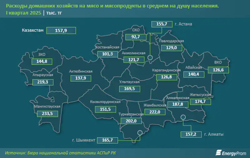Наименьшие расходы на мясо наблюдаются в Северо-Казахстанской области (92,7 тысячи тенге), хотя эта сумма увеличилась на 8% по сравнению с прошлым годом, она все еще на 41,3% ниже среднереспубликанского уровня. Следуют Костанайская область (101,3 тысячи тенге) и Акмолинская область (121,7 тысячи тенге).