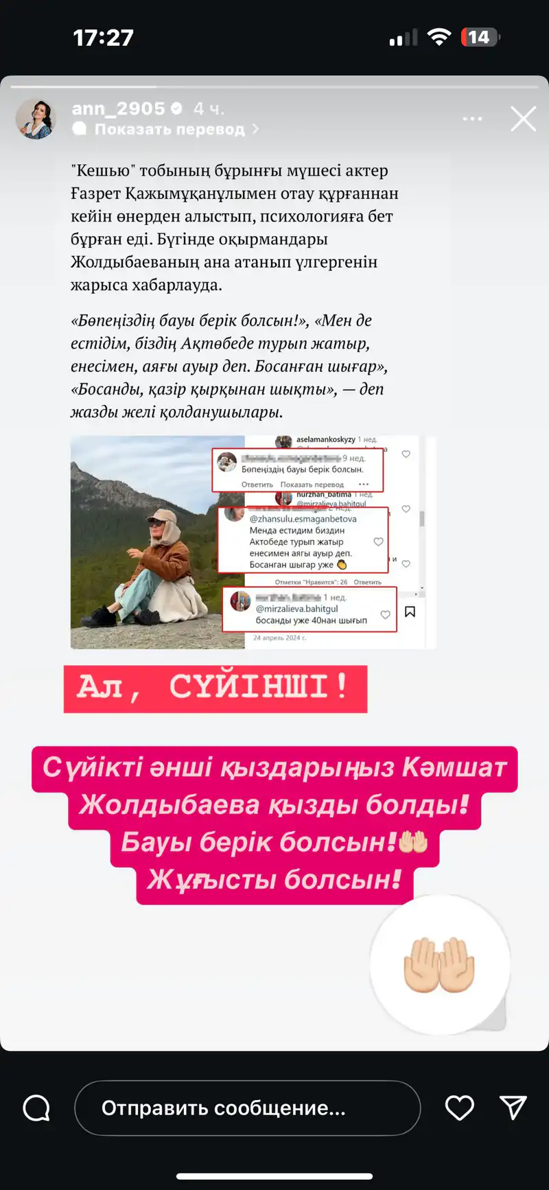 "Радостная новость! Ваша любимая певица Кәмшат Жолдыбаева стала мамой девочки. Пусть растет здоровой! Пусть счастье будет заразительным!"