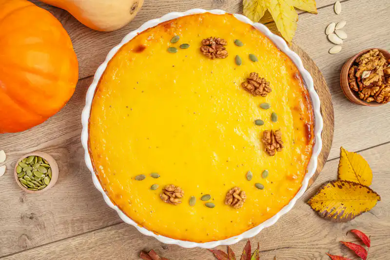 Смешайте тыквенное пюре с яйцами и сахаром, добавьте муку и специи. Вылейте тесто в форму и выпекайте при 180 °C 35–40 минут до румяного состояния.