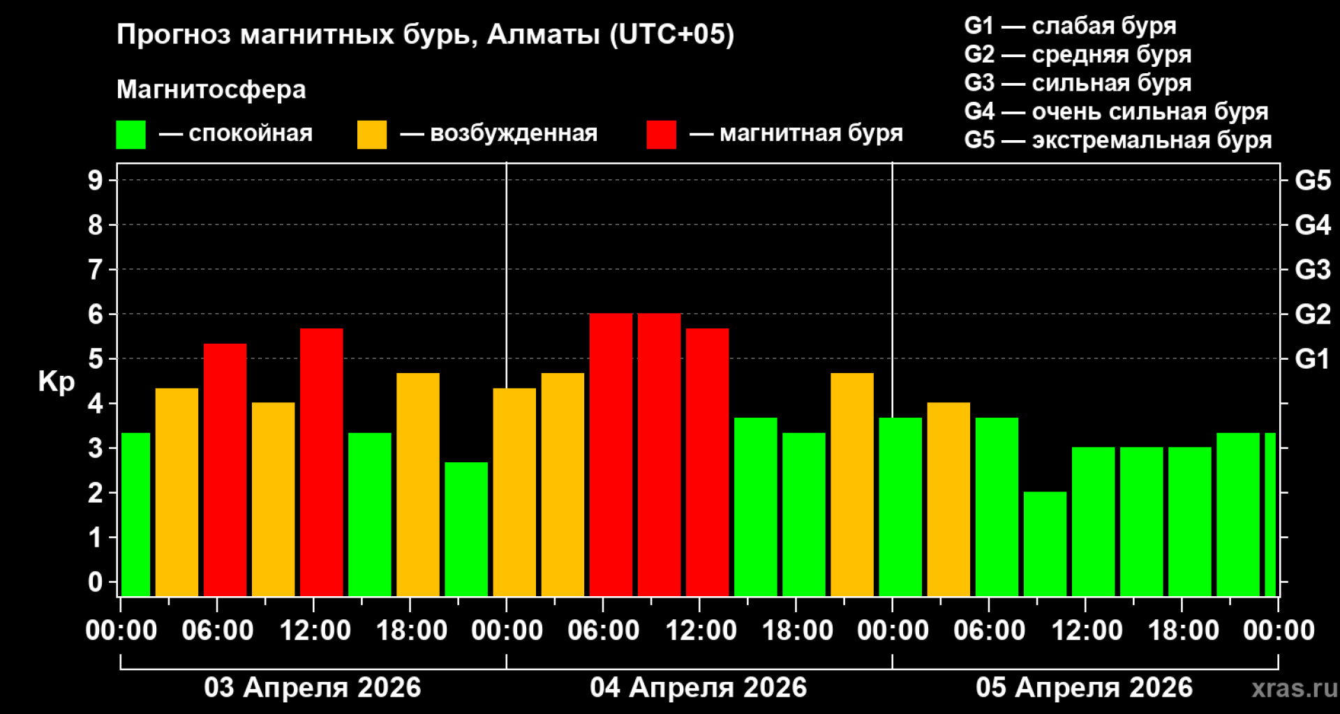Завтрашнее утро, 4 апреля, может стать сложным для многих, так как на Землю надвигается магнитная буря уровня G2. Ожидается, что её пик придется на период с 06:00 до 14:00, и вероятность геомагнитной активности в Алматы составляет 100%. Это связано с усилением солнечного ветра, вызванным корональной дырой на Солнце.