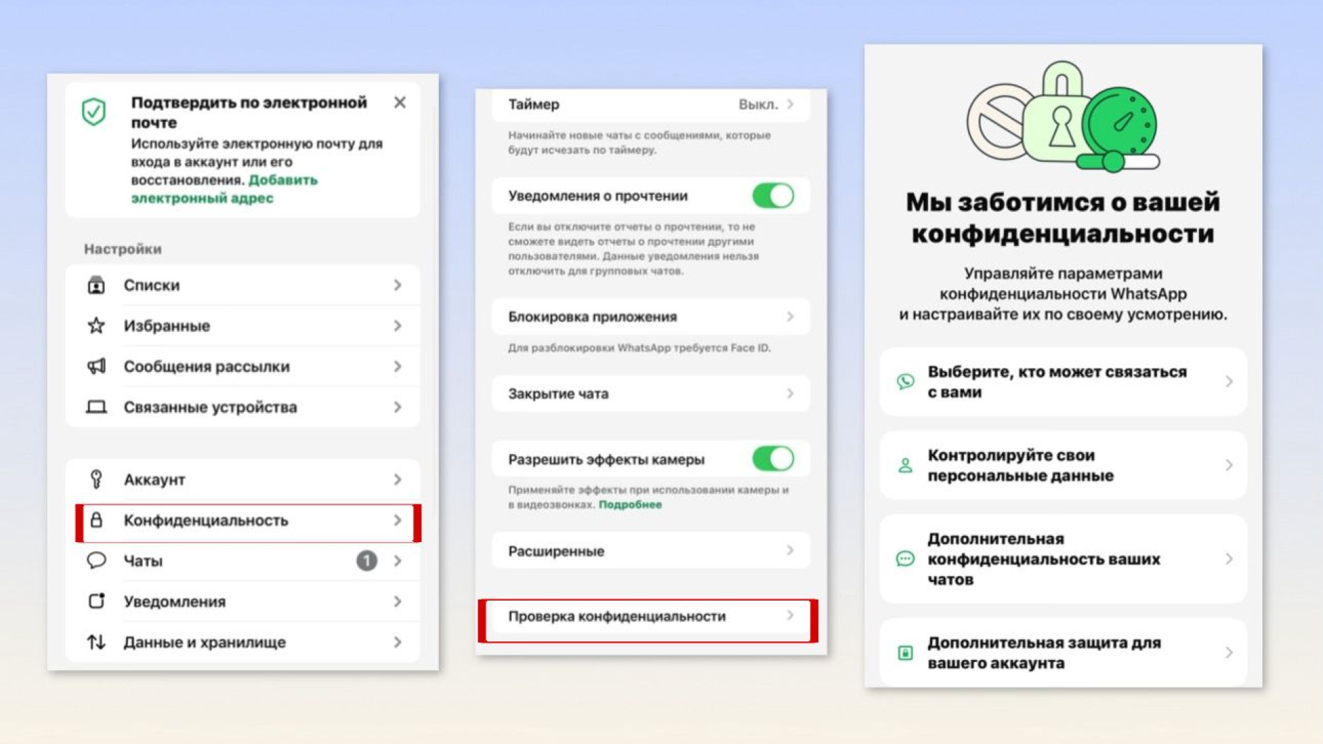 С помощью этой функции пользователи могут быстро проверить, кто имеет доступ к их личной информации и может с ними связываться. В разделе "Проверка конфиденциальности" доступны следующие настройки: