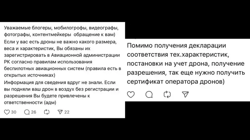 "Уважаемые блогеры, мобилографы, видеографы, фотографы, контент-мейкеры! Если у вас есть дроны, неважно, какого размера, веса и характеристик, вы обязаны их зарегистрировать в Авиационной администрации, согласно правилам использования беспилотных авиационных систем (правила есть в открытых источниках). Информация для сведения, вдруг не знали. Если вы подняли ваш дрон в воздух без регистрации и разрешения, вы будете привлечены к ответственности", — говорится в обращении.
