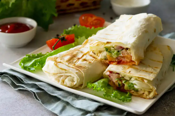 Нарежьте овощи и мясо, приготовьте соус. Смажьте лаваш соусом, добавьте салат, овощи и мясо, затем сверните в рулет и нарежьте порционно.