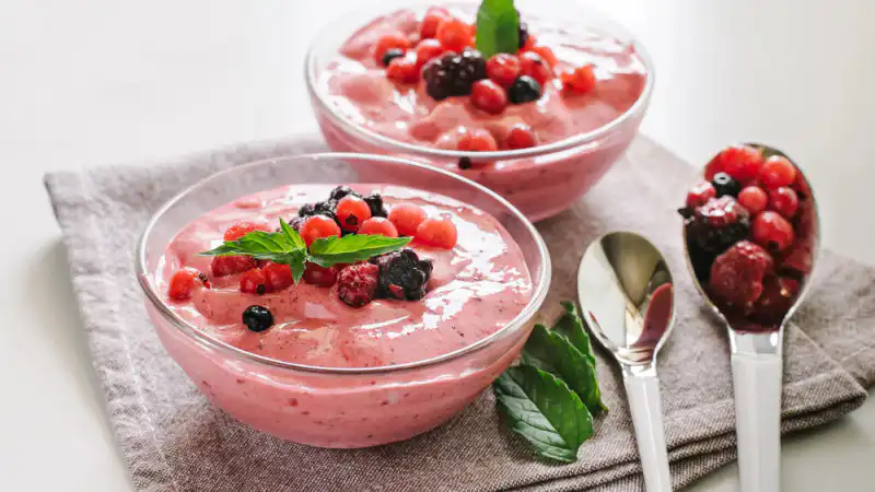 Смешайте в блендере банан, ягоды и йогурт до получения густой однородной массы. Переложите смузи в глубокую тарелку или чашу и украсьте сверху гранолой, свежими ягодами, орехами, мятой или кокосовой стружкой. Этот десерт не только вкусен, но и отлично подходит для полезного завтрака.